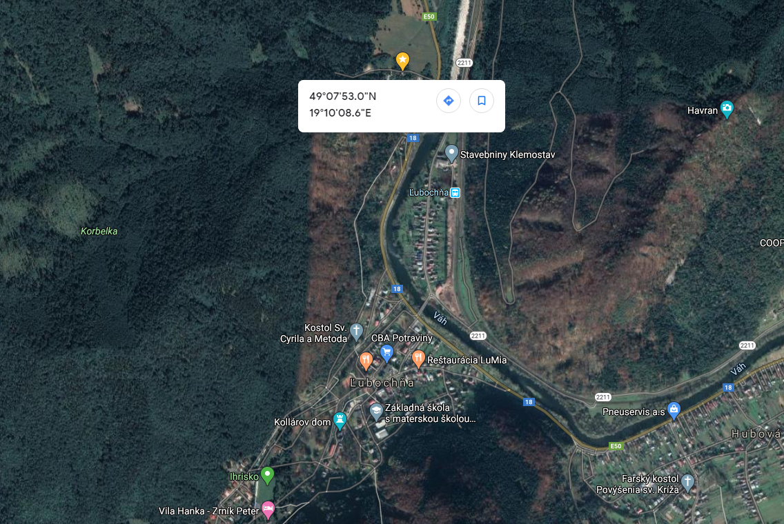 Satelitná mapa našej krásnej Ľubochne. GPS súradnice k nám sú uvedené na mape hore. Žltým balónikom je označené miesto sídla spoločnosti.